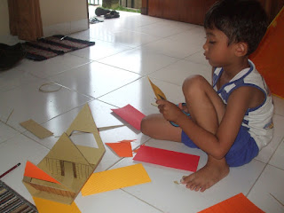 Kerjasama pun dimulai. Sementara Papa mengelem kertas yellow board menjadi dinding-dinding rumah, Amay menggunting kertas kokoru yang akan dipakai untuk atap. Kertasnya warna-warni, supaya cerah ceria, hihihi... Lagipula, genting atau atap tidak harus coklat kan? Terserah Amay saja, gimana bagusnya. Hehehe...