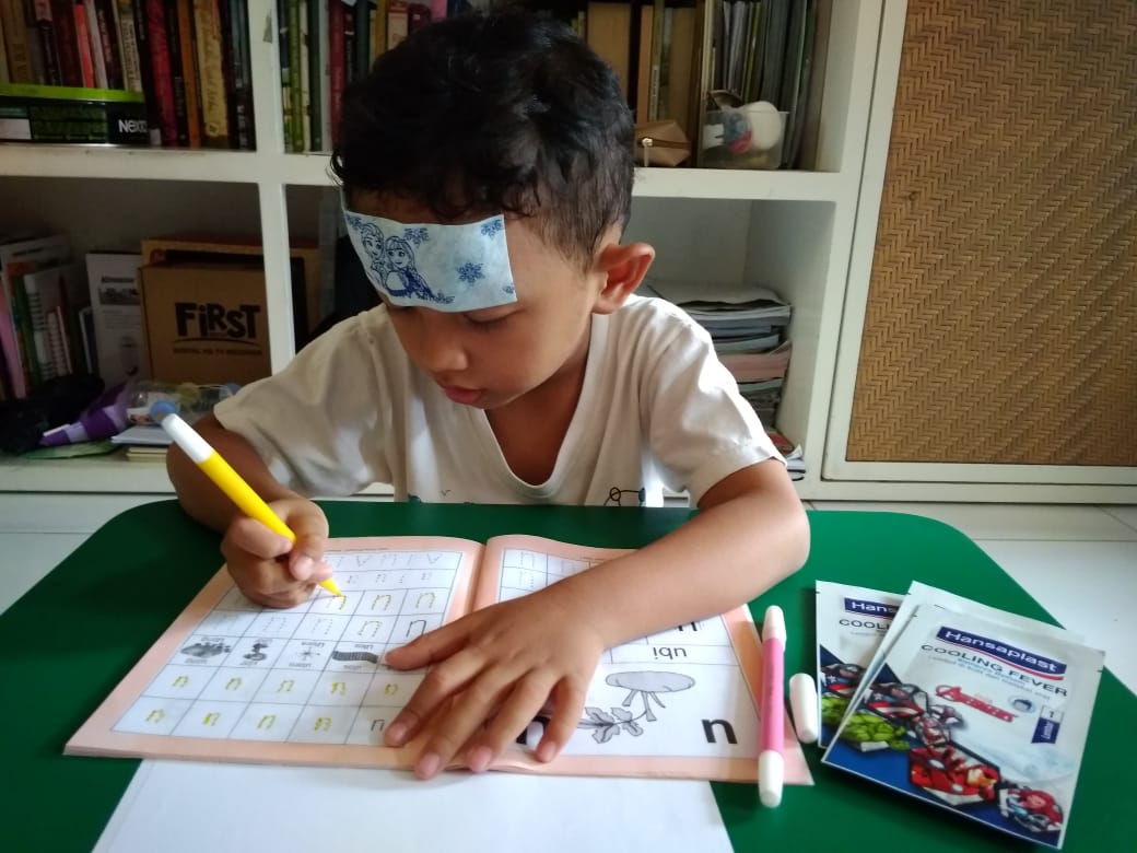 Melanjutkan cerita soal sakitnya Aga kemarin, setelah sampai rumah, saya pun menempelkan Hansaplast Cooling Fever ke dahinya. Kebetulan dia pilih karakter Disney Frozen, karena karakter Marvel Avengers-nya disayang-sayang. Save the best for the last pokoknya, xixixi... Kemudian, ia tidur. Bangun tidur, Aga merasa harus belajar karena dia pulang terlalu pagi, wkwkwk.. Ada-ada saja. 😂
